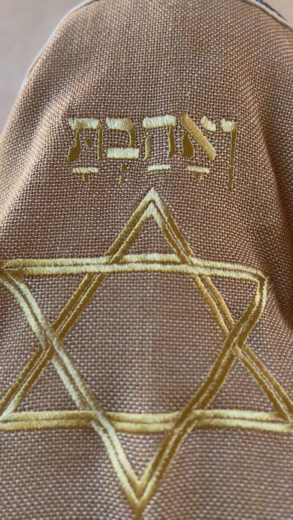 This design is unique in its color combination of green, black and silver stripes on a brown background with embroidered Star of David and the word ואהבת in the middle.
