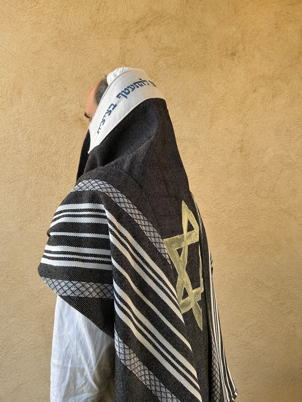 This design is unique in its color combination of white stripes on a black background with Star of David painted un the middle.