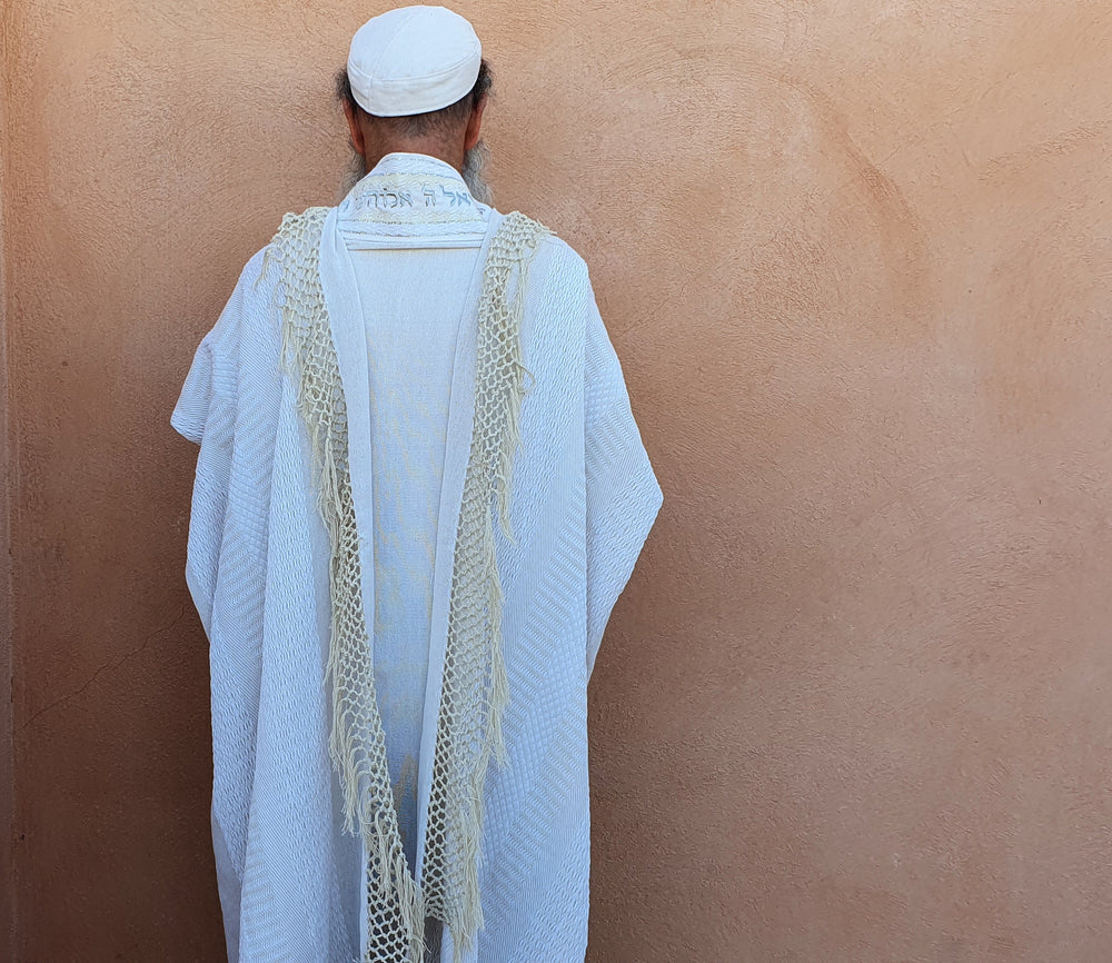 Jewish man's prayer shawl (also called tallit in Hebrew) made of cotton.