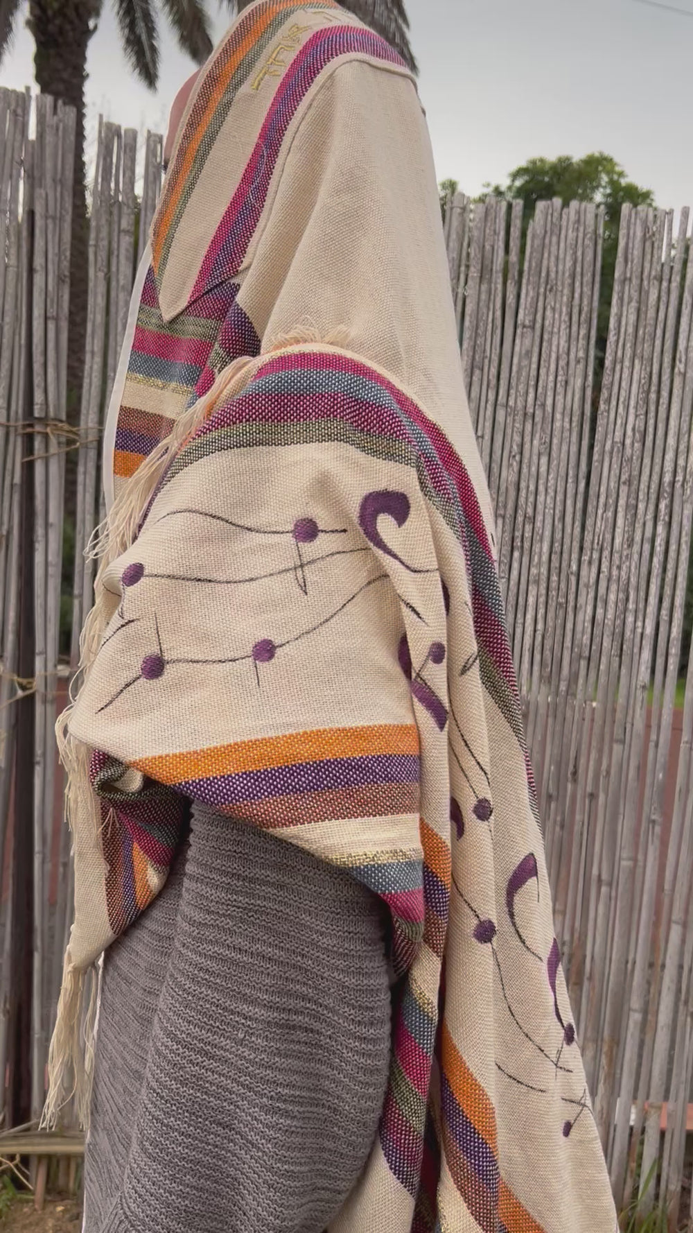 This design is unique in its color combination of red, orange, green and some gold stripes on cream background. On the back, the tallit is hand-painted with a colorful tree of life. On the sides of the tallit there are hand-painted musical notes.  The tallit is handwoven from fine cotton on traditional looms by Jewish men in Israel.