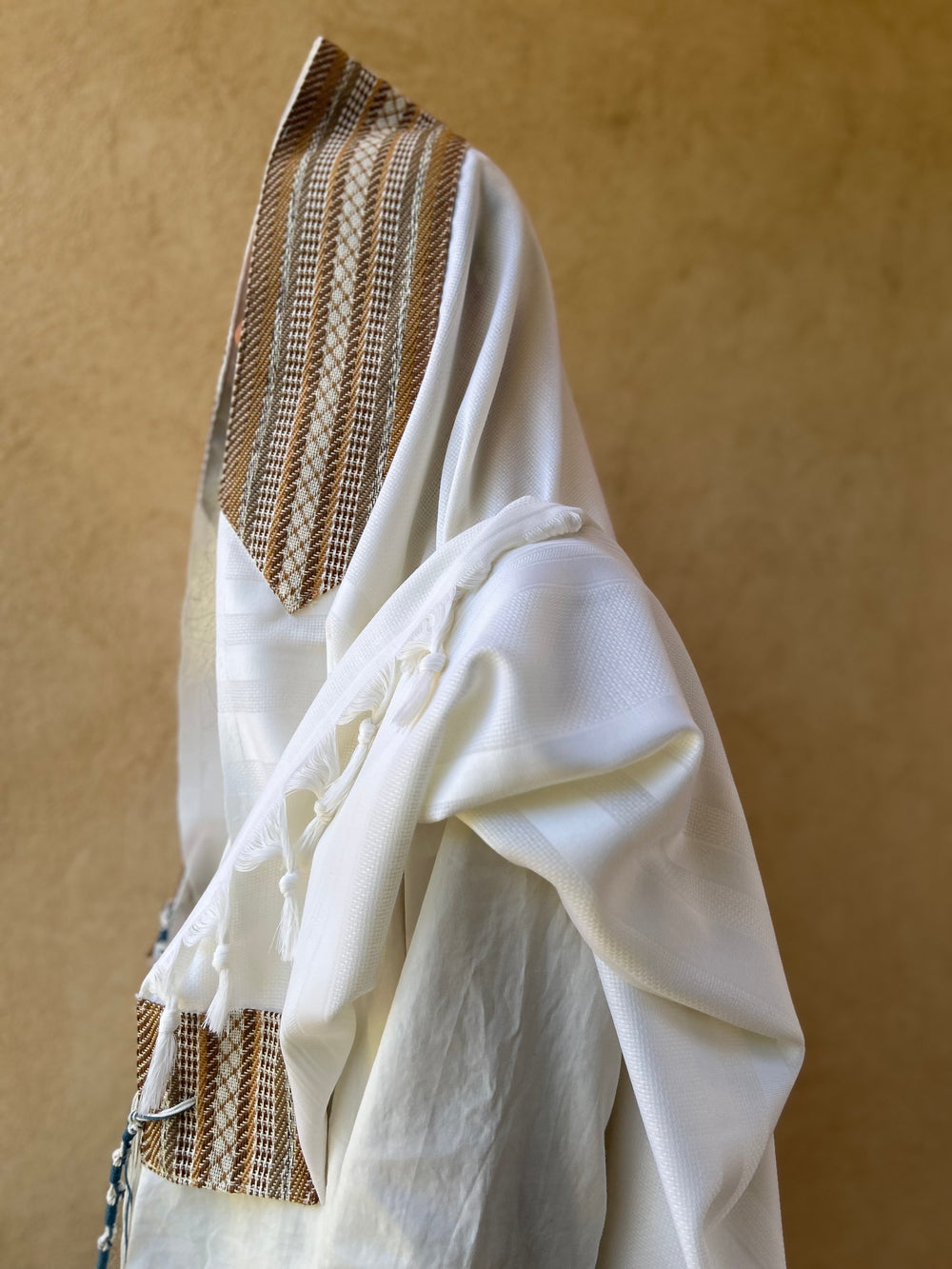 The atara of this tallit is handwoven from fine brown thread on traditional looms by Jewish men in Israel.