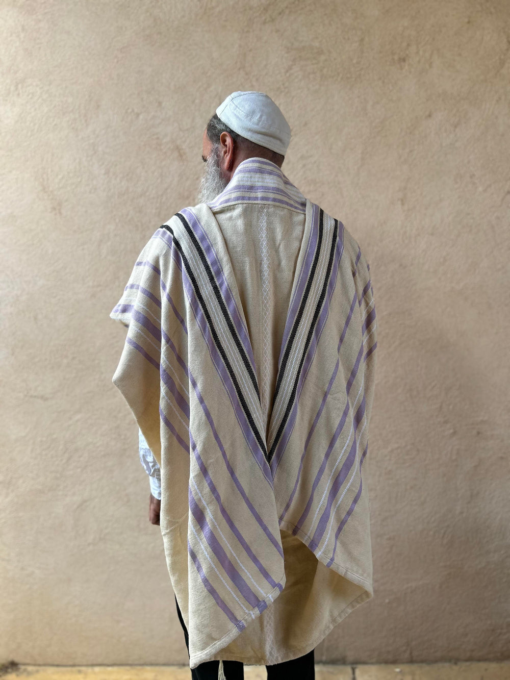 The design of this prayer shawl is a classic design in lavender purple, black, and white stripes. The tallit is handwoven from fine cotton on traditional looms by Jewish men in Israel.