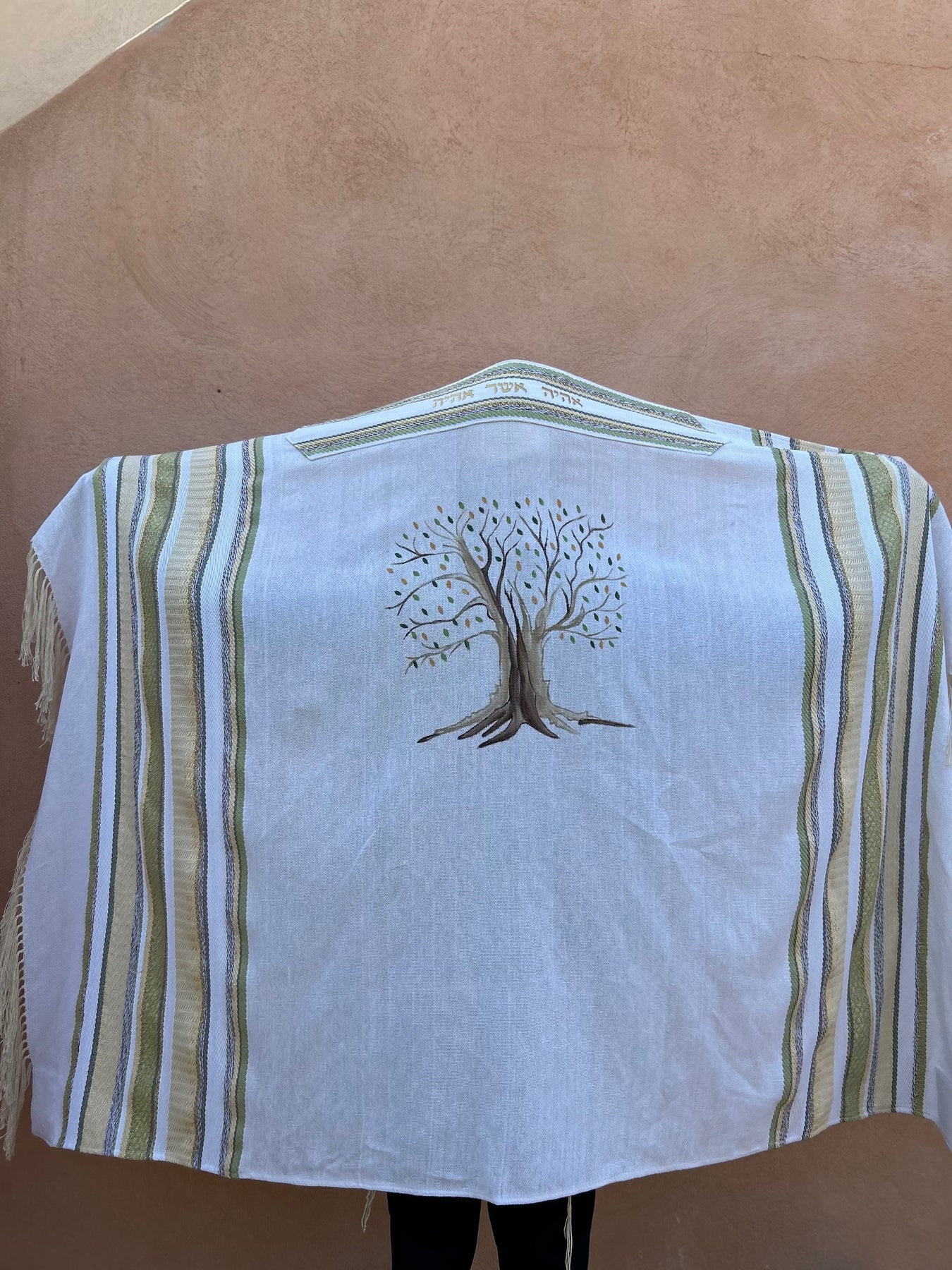 Jewish man's prayer shawl (tallit in Hebrew) is made of cotton. The design this tallit is a combination of green, light blue, and gold along with cream and white colors. On the back, the tallit is hand-painted with a colorful tree of life. The tallit is handwoven from fine cotton on traditional looms by Jewish men in Israel. We tie the Tzitzit in Ashkenazi style. If you prefer a different style of tying please mention it in your order. Purchase this elegant tallit for the Jewish wedding bridegroom.