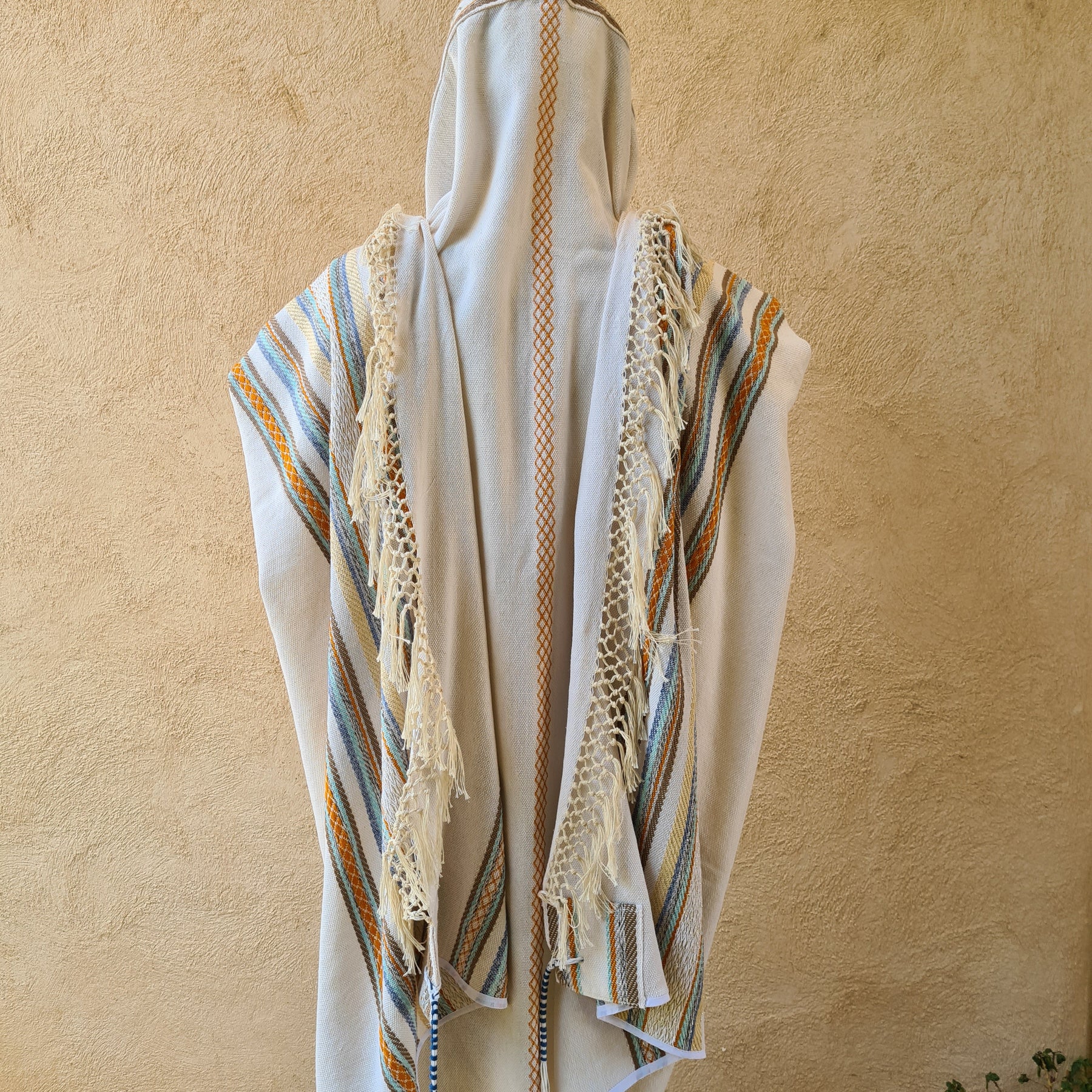 The tallit is handwoven from fine cotton on traditional looms by Jewish men in Israel.